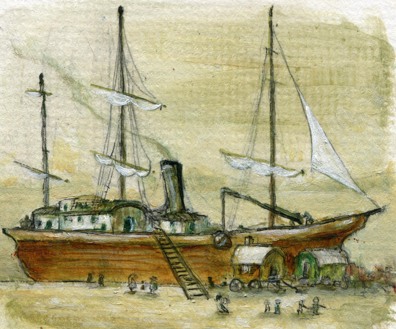 Out in the bay, the Obscura steams toward the cove, captained by Jack Fogg, with first mate Samuel Sippers at his side and Mordecai keeping watch from the crow’s nest.